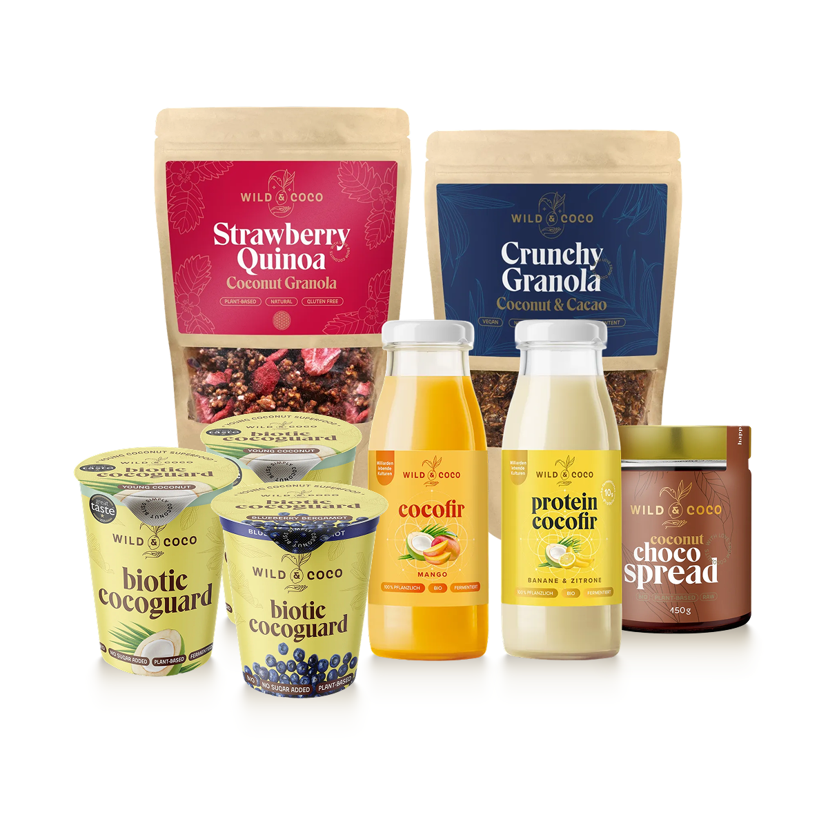 Im Inneren finden Sie: Cocofir Mango, 2× großen weißen Cocoguard, Blaubeer-Cocoguard, Banana Protein Kefir, Granola Schoko + Granola Erdbeere und Choco Spread 150 g. Für hektische Morgen, an denen Sie nicht lange nachdenken, sich aber so ernähren wollen, dass kein schnelles Energietief kommt.